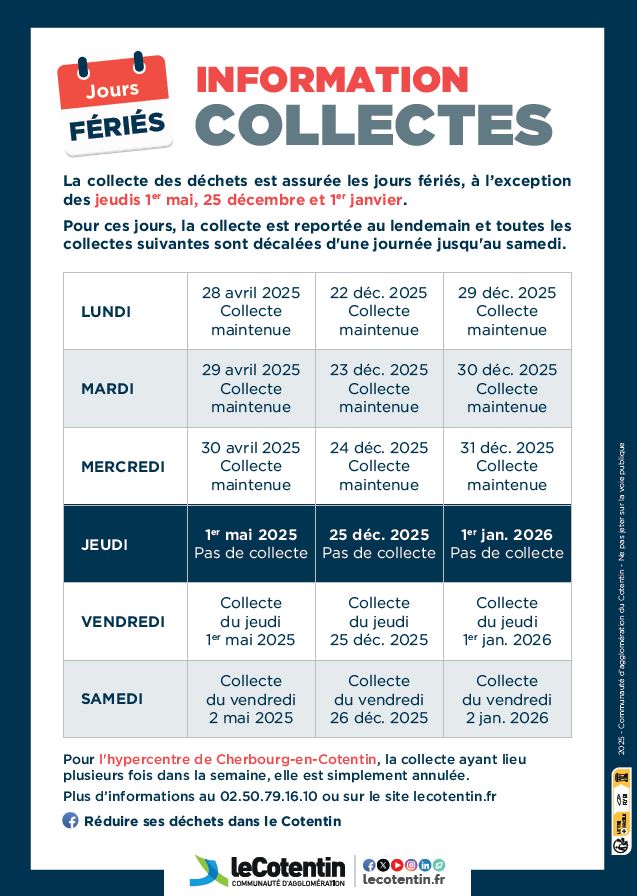 Pour votre parfaite information, l’application Mes déchets le Cotentin a été mise à jour avec l’ensemble de ces informations, des publications Facebook sur la page Réduire ses déchets dans le Cotentin ont été programmées ainsi que des infolocales pour la presse.